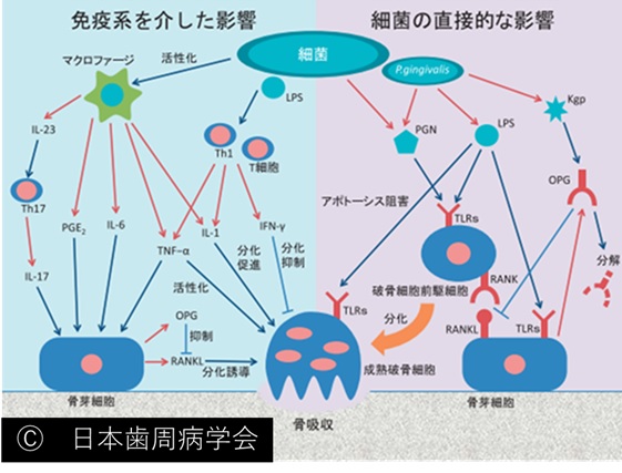 また、細菌が直接骨をもろくする場合もあり、免疫機構と細菌の両方向からの説明がなされています。